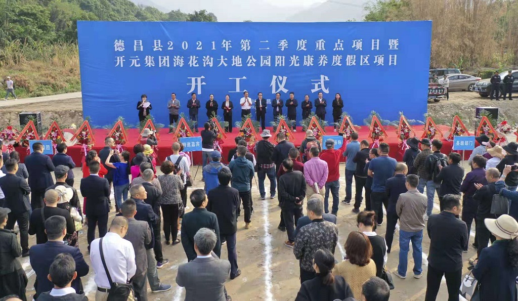 2021年4月9日,德昌縣舉行第二季度重點項目開工儀式,四川開元集團?;洗蟮毓珗@陽光康養度假區項目作為本次開工儀式的主角驚艷亮相。德昌縣委瓦西亞夫書記出席開工儀式并宣布項目開工,縣長李友英為開工儀式致辭,縣委常委劉慶紅主持,縣人大常委會主任吳仲海、縣政協主席邱金華等領導參加。在儀式上,四川開元集團董事長趙思儉先生與集團邀請的意大利著名建筑設計師Curiel Federico分別致辭。